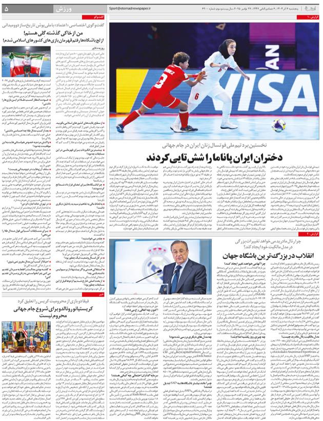 دختران ايران پاناما را شش تايي كردندانقلاب در بزرگ‌ترين باشگاه جهانمن  ازخاكي گذشته گِلي هستم!كريستيانو رونالدو براي شروع جام جهاني  محروم نيست