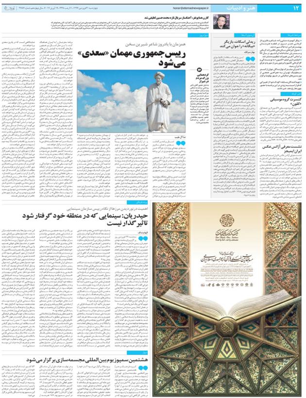 رييس‌جمهوري مهمان «سعدي» مي‌شودحيدريان: سينمايي كه در منطقه خود گرفتار شود تاثيرگذار نيستهشتمين سمپوزيوم بين‌المللي مجسمه‌سازي برگزار مي‌شود