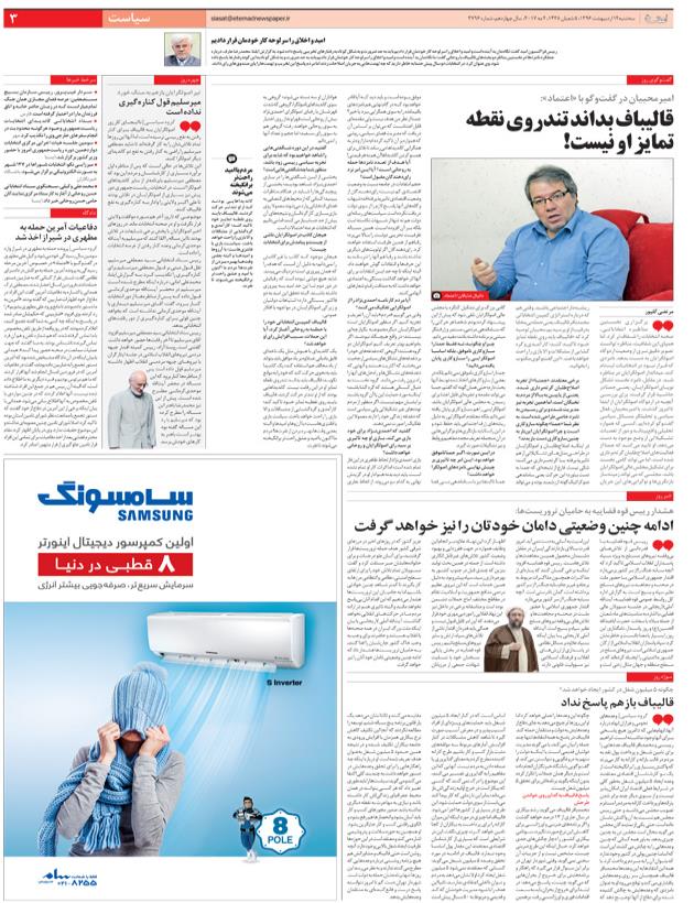 قاليباف بداند تندروي نقطه تمايز او نيست! ادامه چنين وضعيتي دامان خودتان را نيز خواهد گرفتقاليباف بازهم پاسخ ندادميرسليم قول كناره‌گيري نداده استسرخط خبرهادفاعيات آمرين حمله به مطهري در شيراز اخذ شداميد و اخلاق را سرلوحه كار خودمان قرار داديم