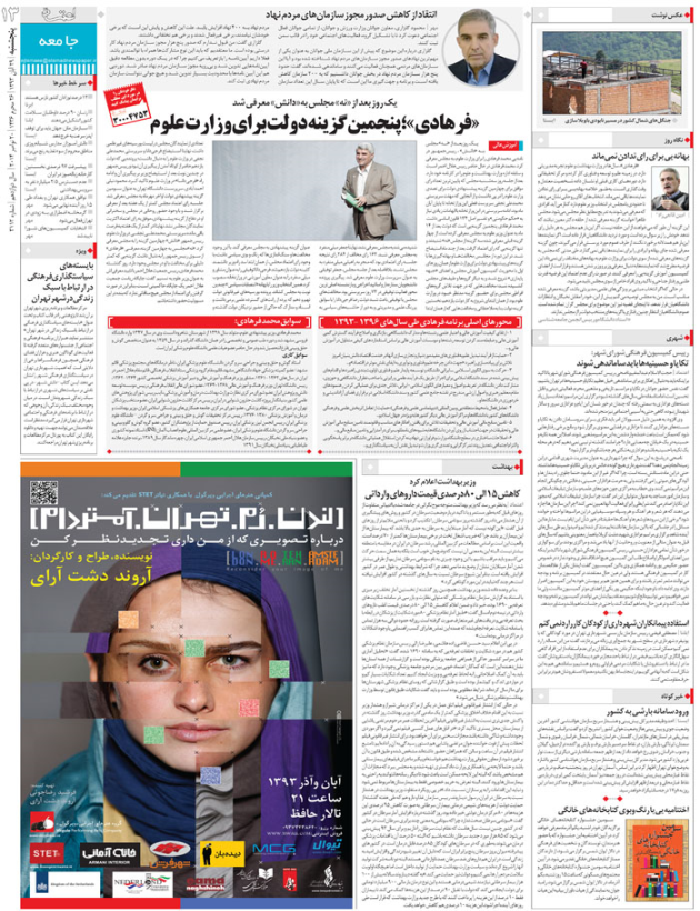 «فرهادي»؛ پنجمين گزينه دولت براي وزارت علوممحورهاي اصلي برنامه فرهادي طي سال‌هاي ۱۳۹۶ -۱۳۹۳سوابق محمد فرهادي:عكس نوشتبهانه‌يي براي راي ندادن نمي‌ماندتكايا و حسينيه‌ها بايد ساماندهي شوندخبر كوتاهسر خط خبرهابايسته‌هاي سياستگذاري فرهنگي در ارتباط با سبك زندگي درشهرتهرانكاهش ۱۵ الي ۸۰ درصدي قيمت داروهاي وارداتي
