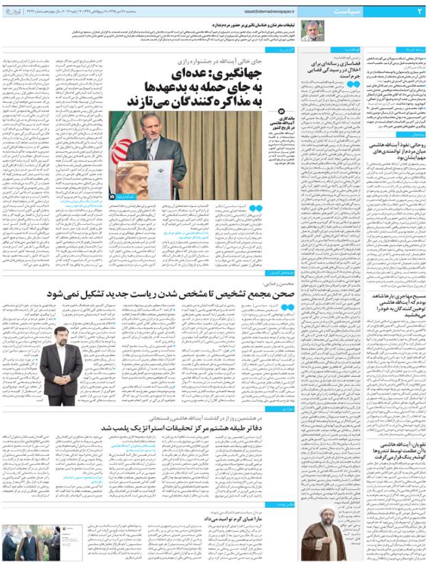 به مذاكره‌كنندگان مي‌تازندصحن مجمع تشخيص تا مشخص شدن رياست جديد تشكيل نمي‌شوددفاتر طبقه هشتم مركز تحقيقات استراتژيك پلمب شدمارا عباي گرم تو اميد مي‌داد